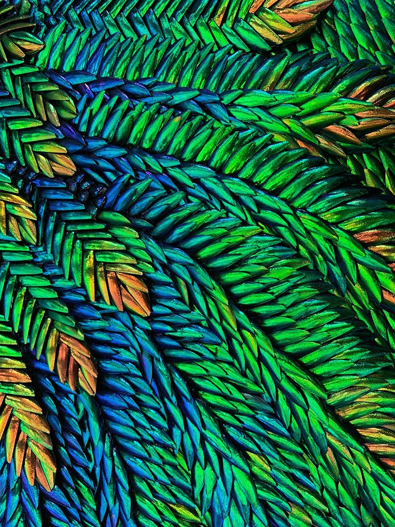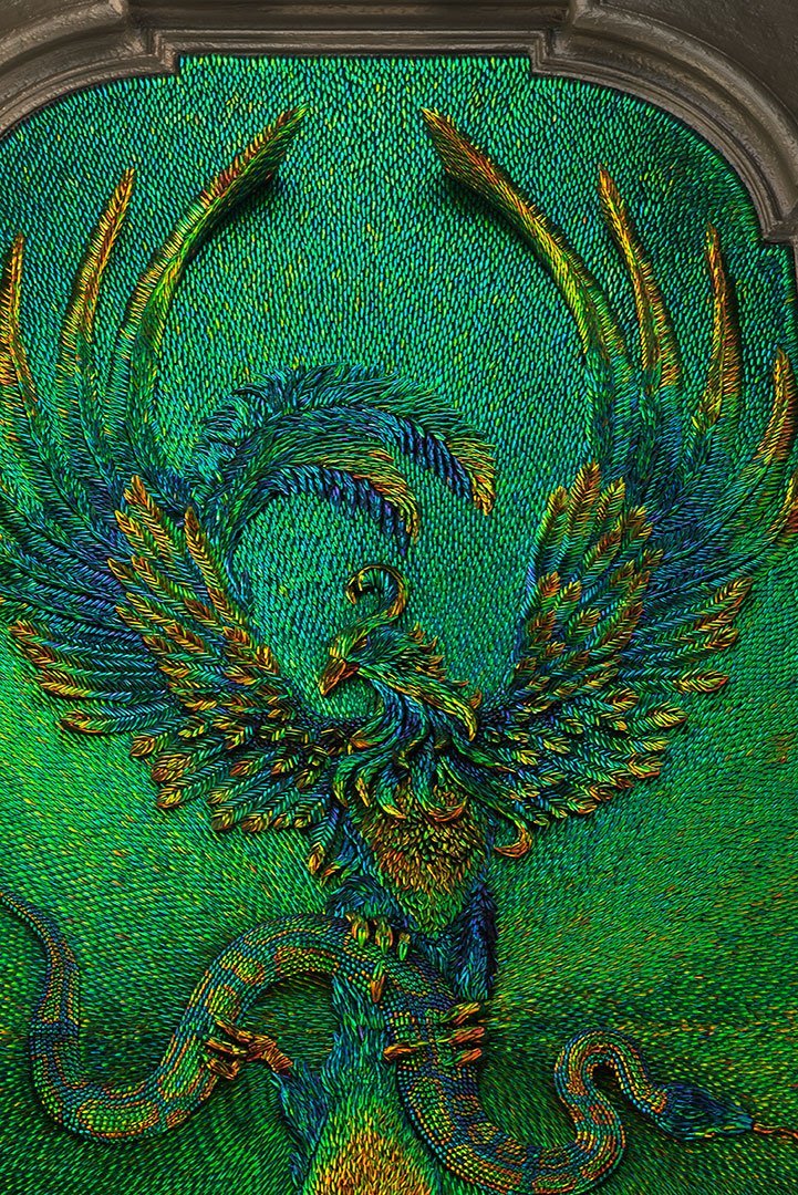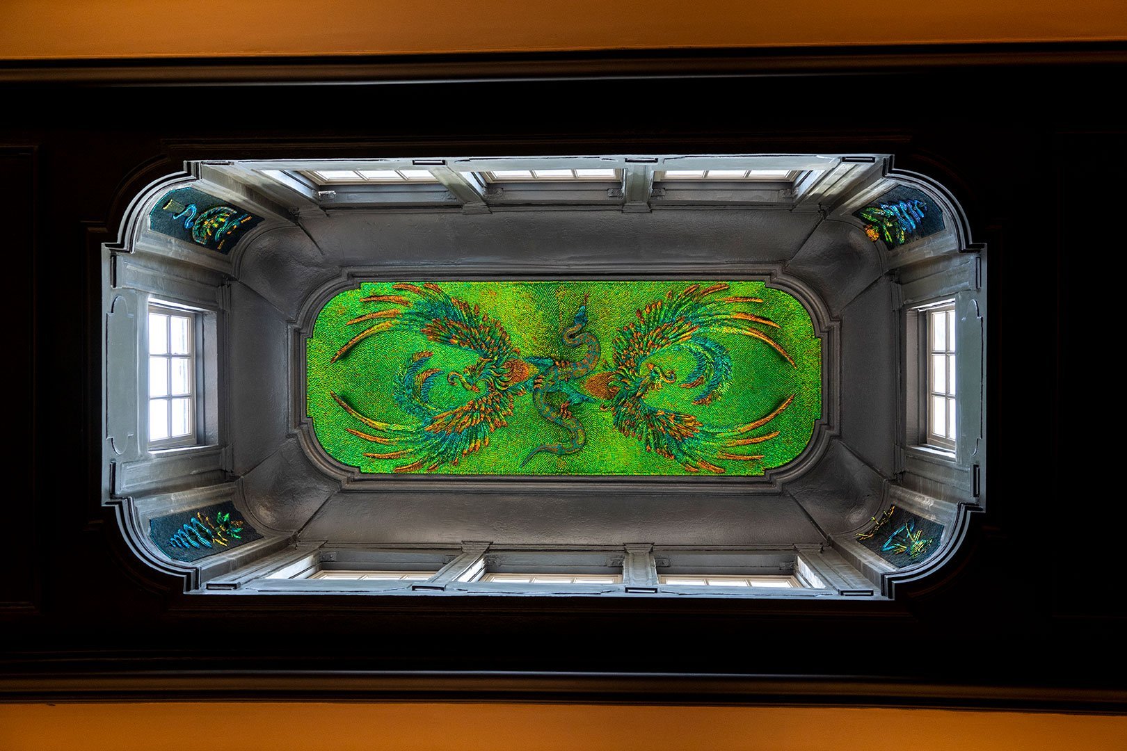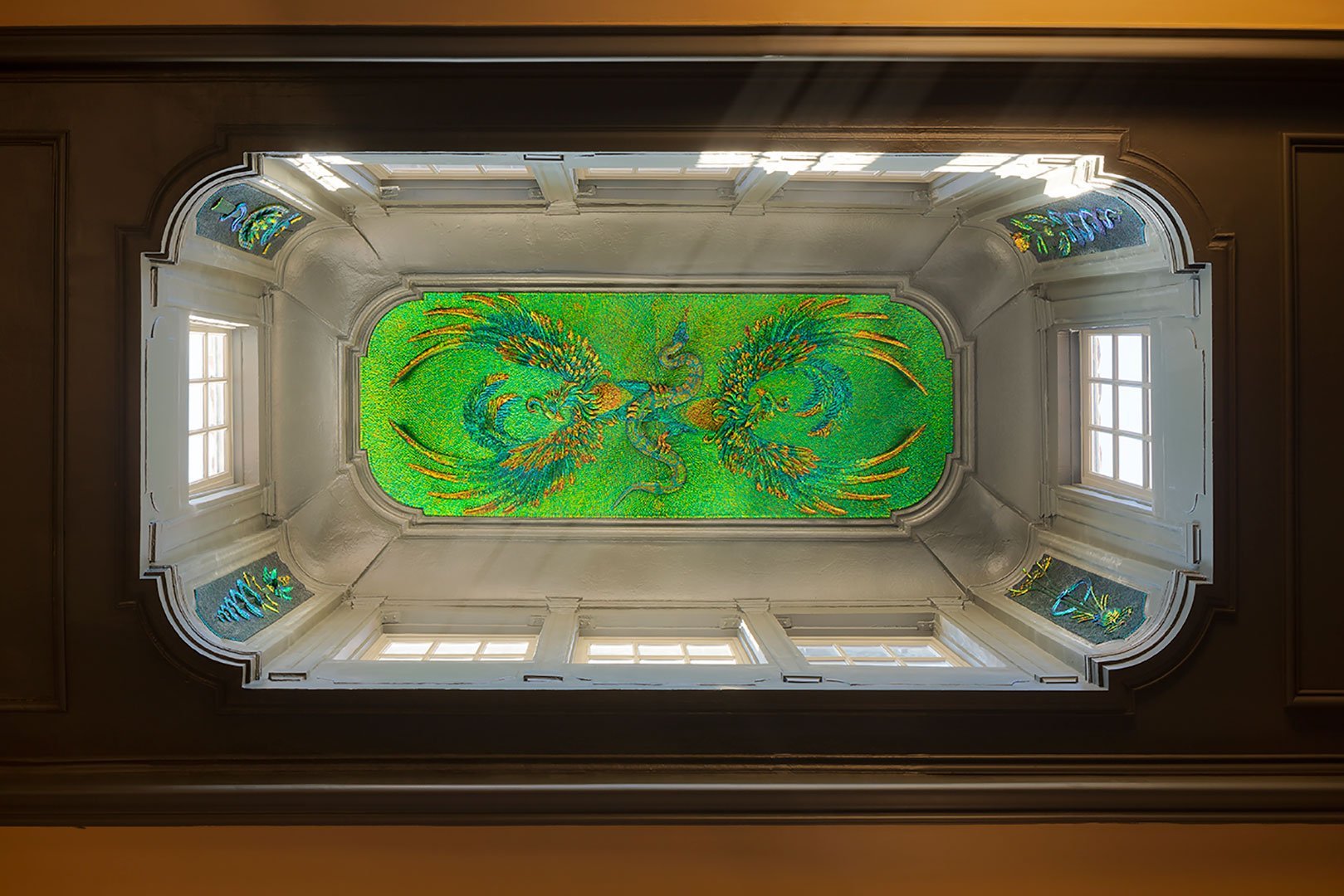 Sertis dans le lanternon qui éclaire la pièce par le dessus, cinq panneaux en bas-relief composés de milliers d’élytres de scarabée, assemblés durant de longs mois, y composent une histoire de Montpellier, évoquant les croisades, la médecine, la justice et l’union sacrée du mariage.