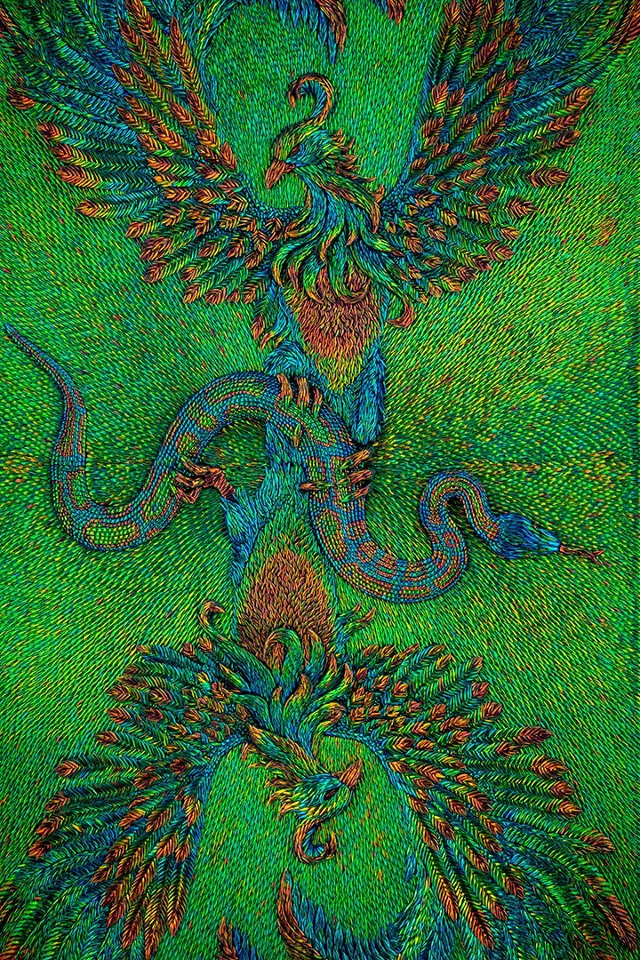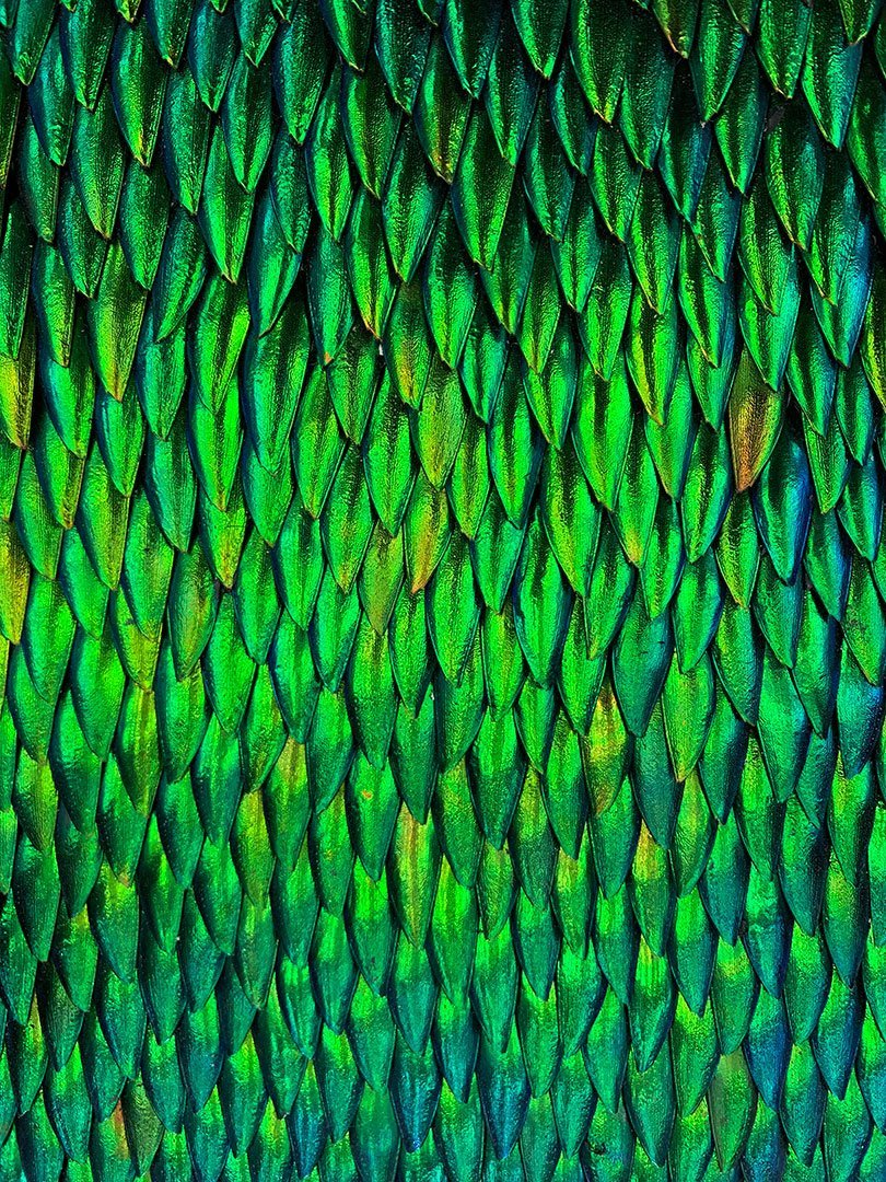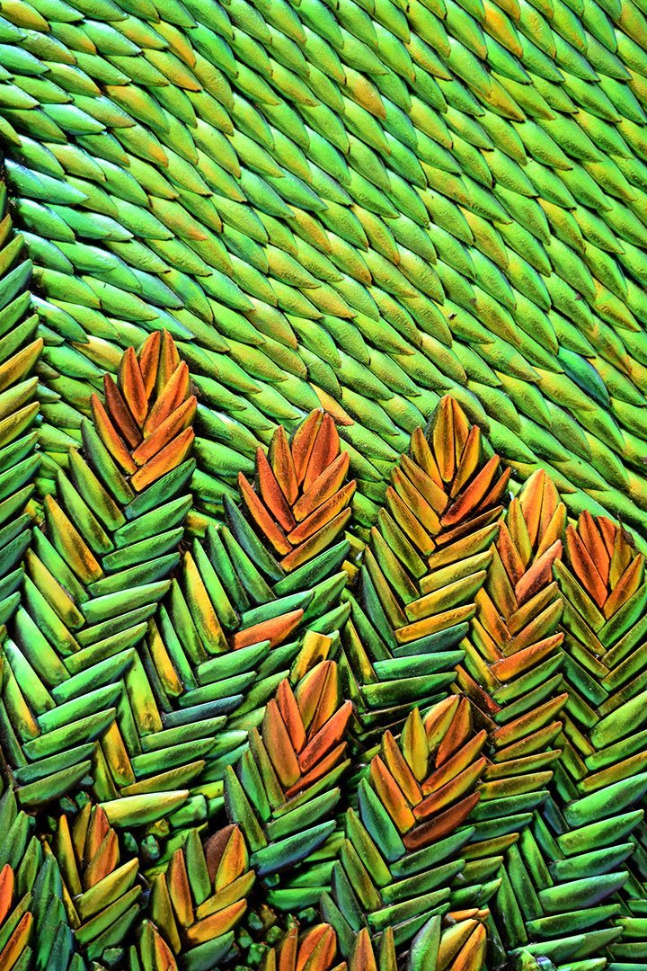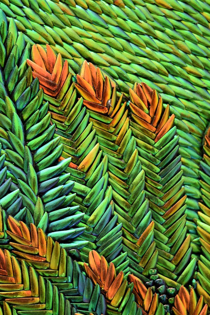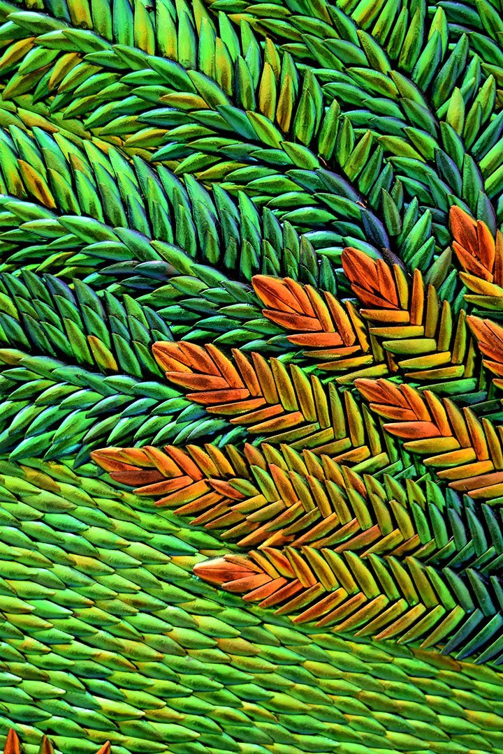 Sertis dans le lanternon qui éclaire la pièce par le dessus, cinq panneaux en bas-relief composés de milliers d’élytres de scarabée, assemblés durant de longs mois, y composent une histoire de Montpellier, évoquant les croisades, la médecine, la justice et l’union sacrée du mariage.