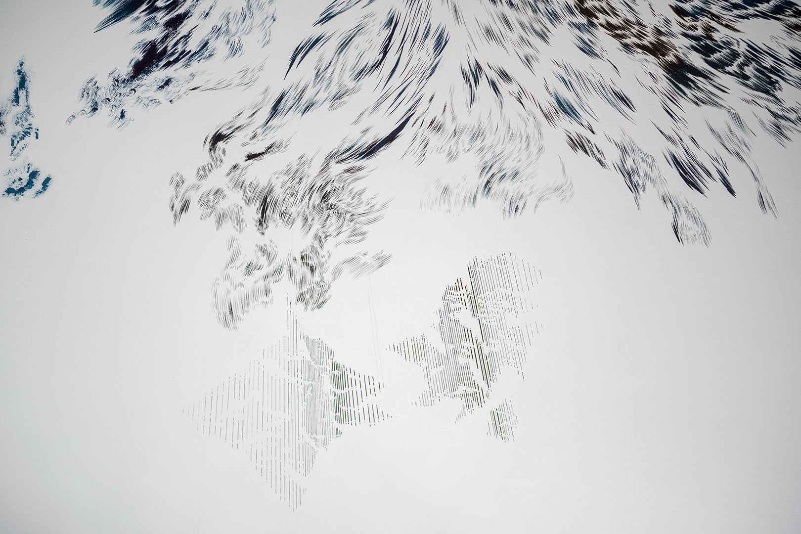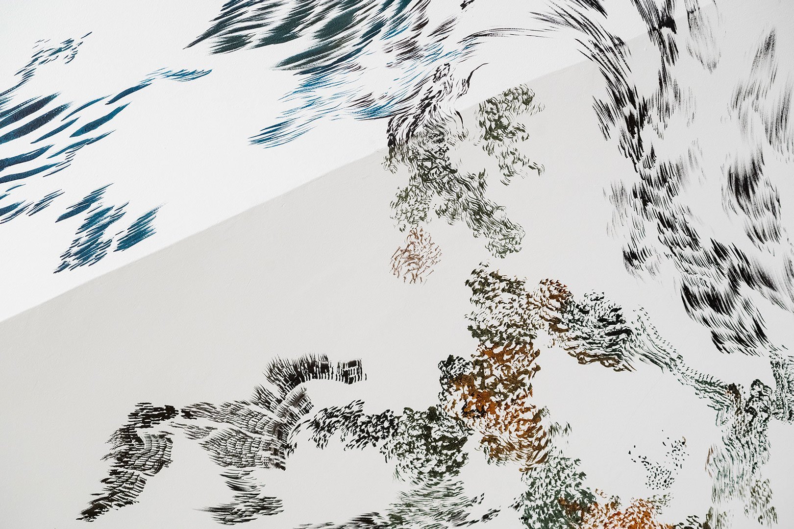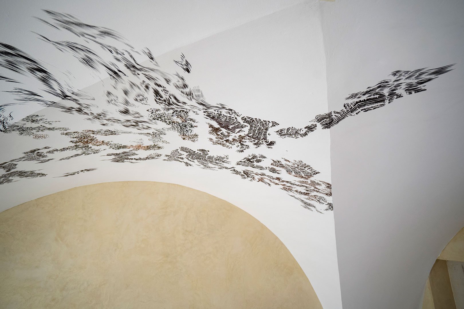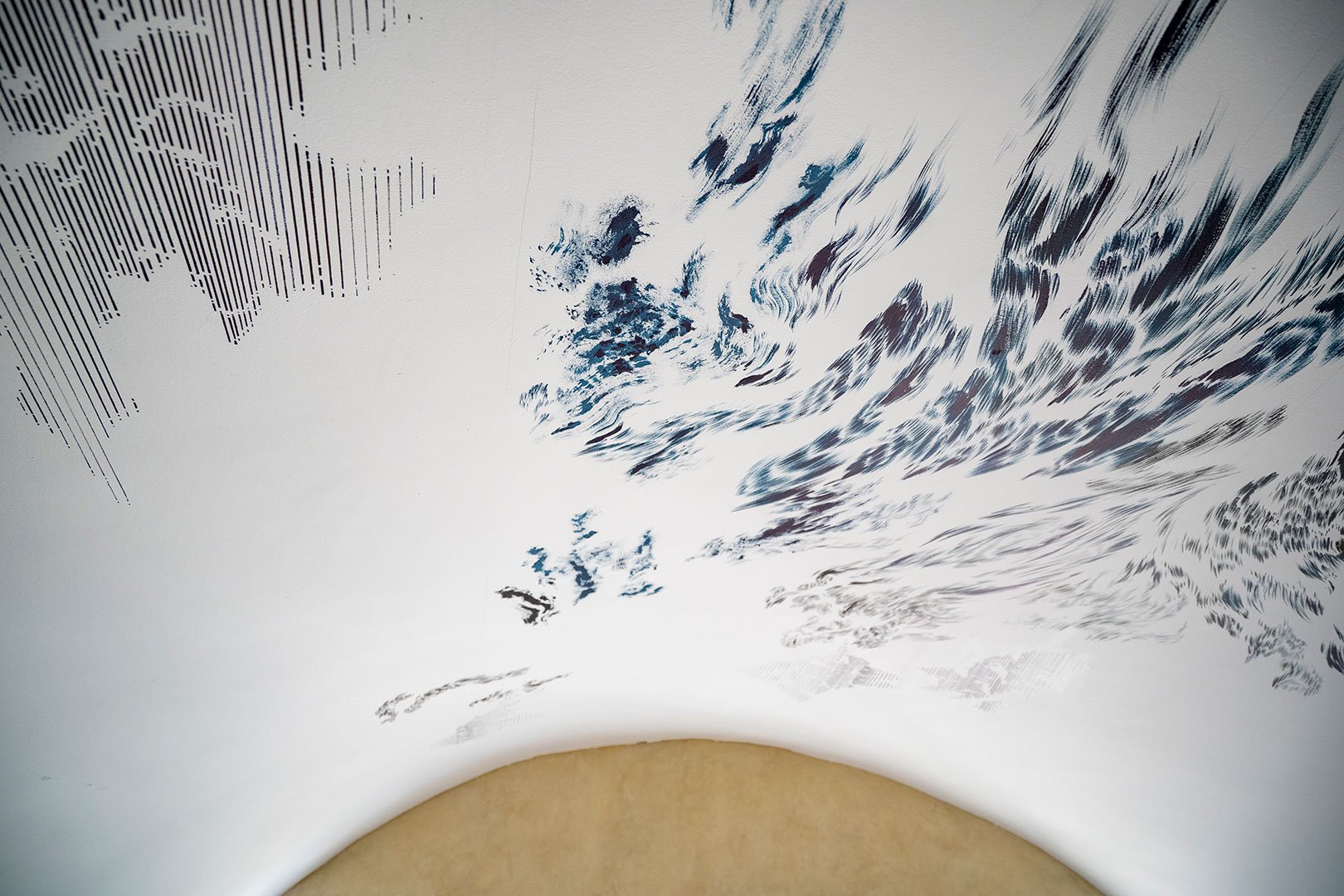 Chaque élément se déploie sur un quartier de voûte : les flux marins effleurent les creux de matière et d’encre laissés par l’air, les rougeoiements du feu viennent lécher les strates brunes illustrant la terre… Les quatre éléments s’entremêlent pour évoquer cette quête qui fit tourner les têtes des penseurs et scientifiques de toutes les époques, attachés à comprendre et dominer les transformations de la matière, à la recherche de richesse et d’éternité.